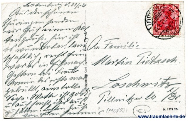 – Details – Jahr: ca. 1920 Status: gelaufen 1921 Beschriftung vorne: Eisenach, Das Burschenschaftsdenkmal, (EARE),... Beschriftung hinten: Verlagsanstalt Carl Jagemann, Hofl., Eisenach, M 1274 20 Stempel: Leutenberg (Thüring...), 21.5.21. 4-5N Hinweis: