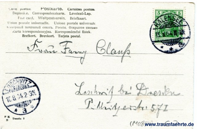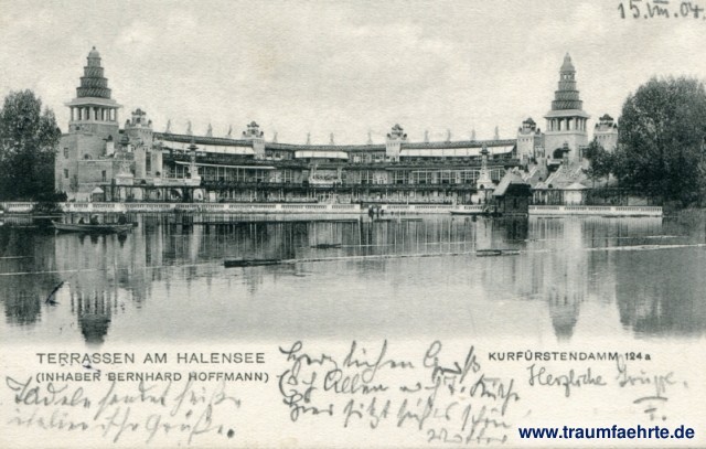 – Details – Jahr: ca. 1900 Status: gelaufen 1904 Beschriftung vorne: Terrassen am Halensee (Inhaber Bernhard Hoffmann), Kurfürstendamm 124a Beschriftung hinten: Carte postale. Postkarte. Cartolina postale. Dopisnice. Correspondenzkarte. Levelezö-Lap. Post card. Weltpostverein. Briefkaart. Union postale universelle. Union postale universale. Всемирный почтовый союз. Россия. Открытое письмо. Karte korespondencyjna. Korespondencni lístek. Brefkort. Brevkort. Tarjeta postal. P K B, Dessin 2 Stempel: Halensee, a, 15.8.04 10-11N.; Loschwitz, a, 16.8.04.2-3N. Hinweis: