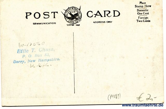 – Details – Jahr: ca. 1910 Status: ungelaufen Beschriftung vorne: North Side Drive around Beaver Lake, Derry N. H. Beschriftung hinten: Post Card, Frank W. Swallow Post Card Co. Inc. Exeter N. H. Communication, Address only, Place Stamp Here / Domestic One Cent / Foreign Two Cents Stempel: Effle T. Chase, P. O. Box 53, Derry, New Hampshire Hinweis: