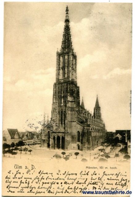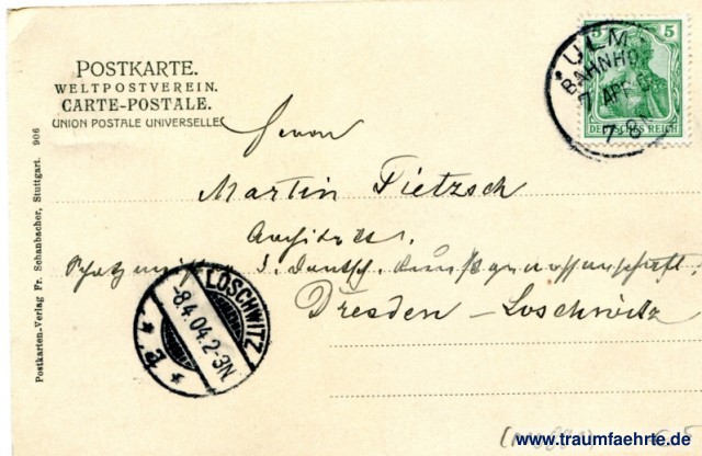 – Details – Jahr: ca. 1900 Status: gelaufen 1904 Beschriftung vorne: Ulm a. D. Münster, 161 m hoch. Beschriftung hinten: Postkarte. Weltpostverein. Carte-postale. Union postale universelle. Postkarten-Verlag Fr. Schanbacher, Stuttgart. 906 Stempel: Ulm, Bahnhof, 7 Apr 04, 7-8N; Loschwitz, a, -8.4.04.2-3N. Hinweis: