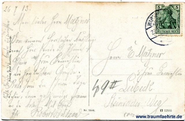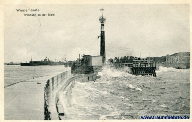– Details – Jahr: ca. 1910 Status: gelaufen 1913 Beschriftung vorne: Warnemünde, Brandung an der Mole Beschriftung hinten: Nr. 7530. 13 12510, Verlag Paul Rechlin, Warnemünde. Stempel: Warnemünde, 2(...), 27.7.13 (...) Hinweis: