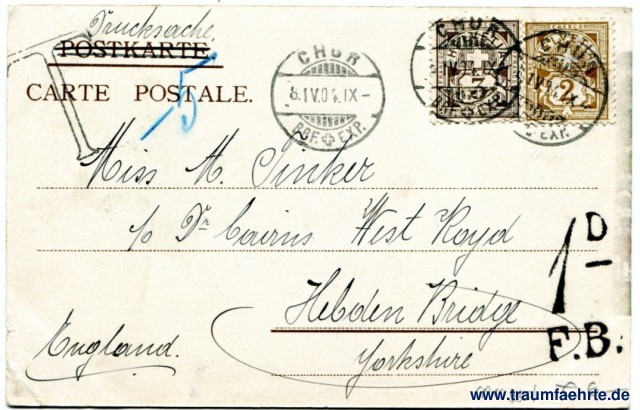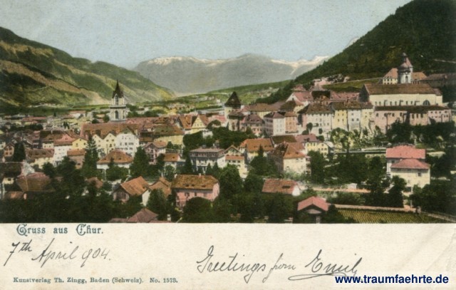 – Details – Year: ca. 1900 Postal state: postally used 1904 Inscription front: Gruss aus Chur. Kunstverlag Th. Zingg, Baden (Schweiz). No. 1573. Inscription back: Postkarte. Carte postale. Postmark(s): 3x Chur, Brf. + Expr., 8.IV.04.IX- Please note: