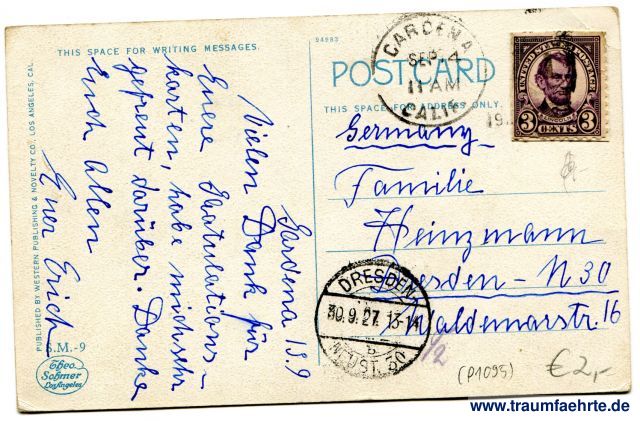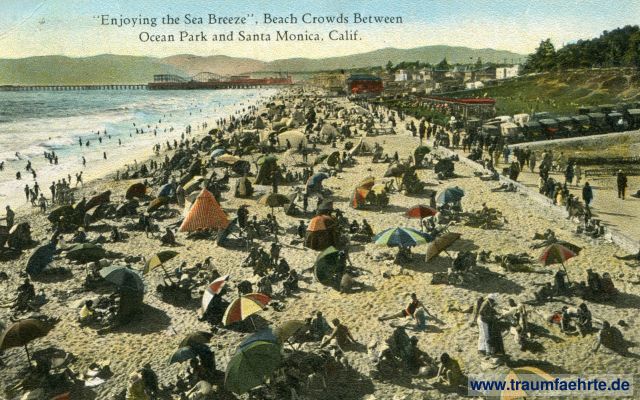 – Details – Jahr: ca. 1920 Status: gelaufen 1927 Beschriftung vorne: Enjoying the Sea Breeze, Beach Crowds Between Ocean Park and Santa Monica, Calif. Beschriftung hinten: This space for writing messages. 94983, Post Card, This space for address only. S.M.-9, Theo Sohmer, Los Angeles, Published by Western Publishing & Novelty Co., Los Angeles, Cal. Stempel: Cardena, Calif. SEP 4, 11 am, 19(27); Dresden-Neust. 30, 30.9.27. 13-14, b Hinweis: