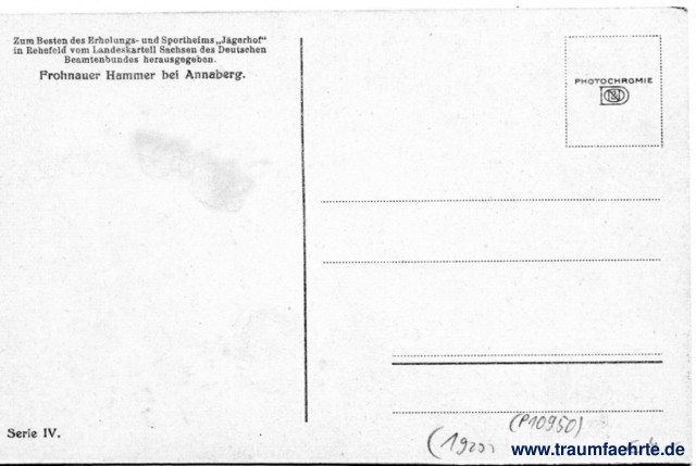 – Details – Year: ca. 1920 Postal state: postally unused Inscription front: no text Inscription back: Zum Besten des Erholungs- und Sportheims Jägerhof in Rehefeld vom Landeskartell Sachsen des Deutschen Beamtenbundes herausgegeben. Frohnauer Hammer bei Annaberg, Serie IV. Photochromie, D&N Postmark(s): none Please note: