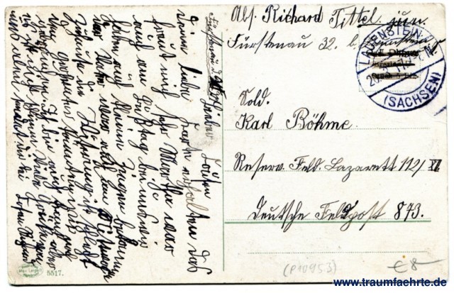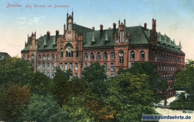 – Details – Jahr: ca. 1915 Status: gelaufen ohne Briefmarke (Feldpost), 1917 Beschriftung vorne: Breslau. Das Konvikt am Domplatz. Beschriftung hinten: Kunstverlag Max Leipelt Warmbrunn, 5517. (...) Breslau II, Stück 5 Pfg Stempel: Lauenstein (Sachsen), 20. 3. 17.7-8 N Hinweis: