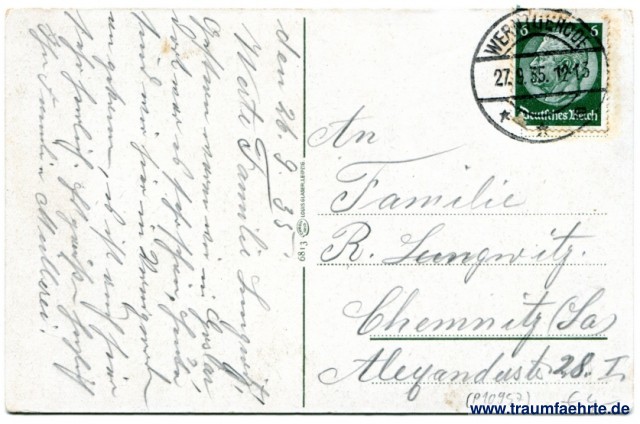 – Details – Jahr: ca. 1930 Status: gelaufen 1935 Beschriftung vorne: Wernigerode, Harz. Beschriftung hinten: 6813, Chrom Iris, Louis Glaser, Leipzig. Stempel: Wernigerode, * * (e), 27.9.35. 12-13 Hinweis: