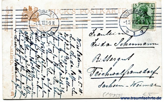 – Details – Jahr: ca. 1905 Status: gelaufen 1910 Beschriftung vorne: Frankfurt-a-M. Eschenheimer Turm. Charles E. Flower, Vilette Beschriftung hinten: Tuck's Postkarte. Carte postale. Postcard. Frankfurt a. M. Eschenheimer Turm. Einer der schönsten von den wenigen noch erhaltenen Tortürmen der ehemaligen Stadtbefestigung. Weite-Weite-Welt Series, Raphael Tuck & Sons Oilette Serie Frankfurt a. M. No. 617B. Hoflieferanten s. maj. des Königs und ihrer maj. der Königin von England. Stempel: 2x Wiesbaden, a 1 a, -1.5.11.8-9 N; --- Hinweis: