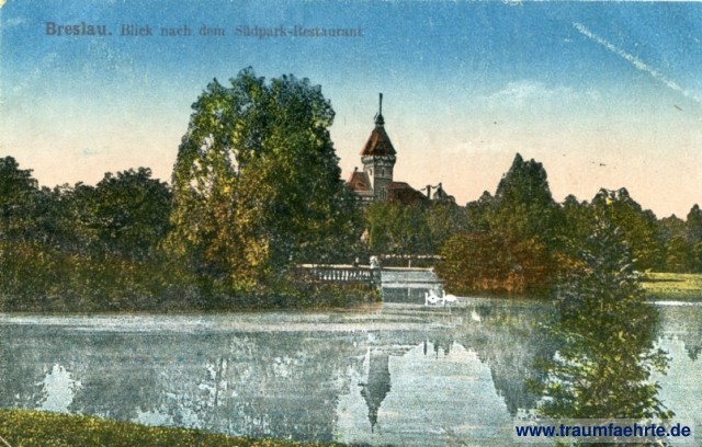 Ansichtskarte Südpark / Park Południowy in Breslau / Wrocław [ Permalink ]Schlagworte: Teiche, Spiegelungen, Gaststätten, Türme, Parks, Schwäne, Tiere, Ostgebiete, Schlesien