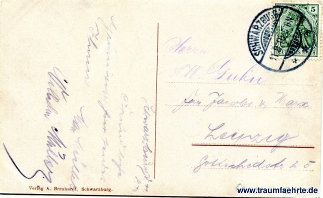 – Details – Jahr: ca. 1905 Status: gelaufen 1910 Beschriftung vorne: Partie im Schwarzatal mit Schweizerhaus Beschriftung hinten: Verlag A. Bernhardt, Schwarzburg. Stempel: Schwarzburg, * * *, 11. 8. 10. 5-6N Hinweis: