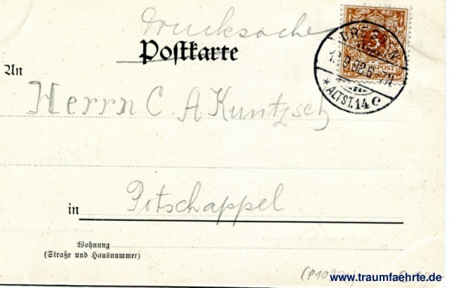 – Details – Jahr: ca. 1895 Status: gelaufen 1898 Beschriftung vorne: Gruss aus Dresden. Ausstellungspalast. Edgar Schmidt, Dresden. 1329 Beschriftung hinten: Postkarte, An ... in ... Wohnung (Straße und Hausnummer) ... Stempel: Dresden-Altst. 14, c, 12.9.98 6-7N. Hinweis: