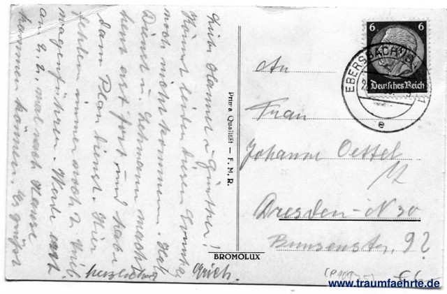 – Details – Jahr: ca. 1935 Status: gelaufen 1939 Beschriftung vorne: Reichenberg Beschriftung hinten: Bromolux, Prima Qualität – F.M.R. Original-Foto Stempel: Ebersbach (Sachsen) 1, e, 28.1.39. -- 9 Hinweis: