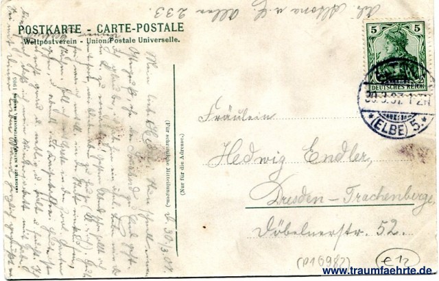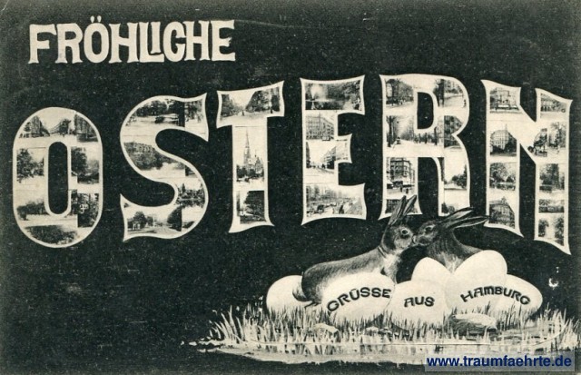 – Details – Jahr: 1905 Status: gelaufen 1907 Beschriftung vorne: Fröhliche Ostern, Grüsse aus Hamburg Beschriftung hinten: Postkarte – Carte-Postale, Weltpostverein – Union Postale Universelle. (Für schriftliche Mitzteilungen.) (Nur für die Adresse.) Knackstedt & Näther, Lichtdruckerei, Hamburg 1905 Stempel: Altona (Elbe) 5. 30.3.07 1-2N. Hinweis: