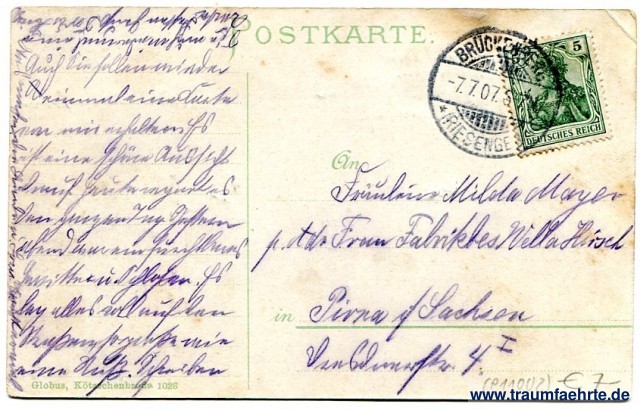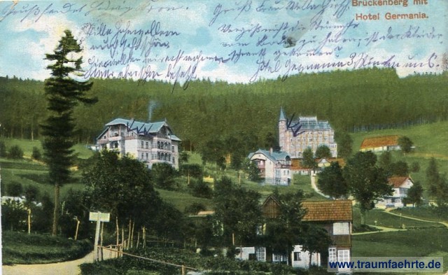 – Details – Jahr: ca. 1905 Status: gelaufen 1907 Beschriftung vorne: Brückenberg mit Hotel Germania. Beschriftung hinten: Postkarte. An ... in ... Globus, Kötzschenbroda 1026 Stempel: Brückenberg (Riesengeb.), -7.7.07.6-7N Hinweis: