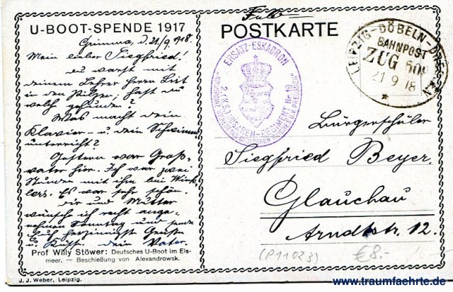– Details – Jahr: 1917 Status: gelaufen ohne Briefmarke (Feldpost), 1918 (Bahnpost) Beschriftung vorne: Willy Stöwer Beschriftung hinten: Postkarte, U-Boot-Spende 1917, Prof. Willy Stöwer: Deutsches U-Boot im Eismeer. – Beschießung von Alexandrowsk. J. J. Weber, Leipzig. Stempel: Bahnpost, Zug 609, 21 9 18, Leipzig-Döbeln-Dresden; Ersatz-Eskadron, 2. (k.s.) Husaren-Regiment Nr. 19, Kronprinz Wilhelm des Deutschen Reiches u. v. Preussen Hinweis: