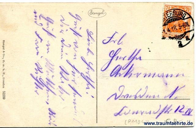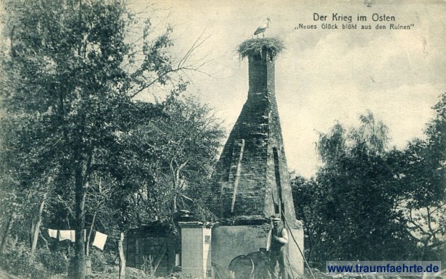 – Details – Jahr: ca. 1918 Status: gelaufen 1918 Beschriftung vorne: Der Krieg im Osten, Neues Glück wächst aus den Ruinen Beschriftung hinten: Stengel, Stengel & Co., G. m. b. H., Dresden, 52289, iF Stempel: (...)sterburg, (... 2), a, (...)1.4.18 5-6N Hinweis: