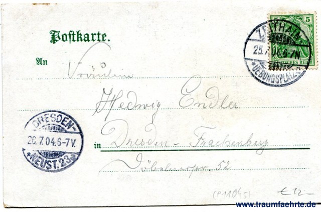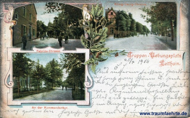 – Details – Year: ca. 1900 Postal state: postally used 1904 Inscription front: Truppen-Übungsplatz Zeithain. Fabrice-Strasse. König-Georg-Strasse. An der Kommandantur. Verlag v. A. verw. Reinhardt, Riesa. Inscription back: Postkarte. An ... in ... Postmark(s): Zeithain-Uebungsplatz (..), 25.7.04.6-7N; Dresden-Neust. 23, a, 26.7.04.6-7V. Please note: