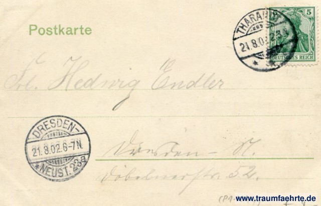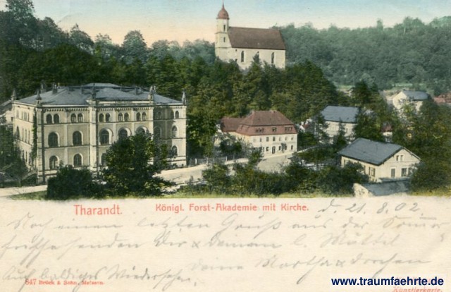 – Details – Jahr: 1898 Status: gelaufen 1902 Beschriftung vorne: Tharandt. Königl. Forst-Akademie mit Kirche. 847 Brück & Sohn, Meissen. Handkolorierte Künstlerkarte. Beschriftung hinten: Postkarte Stempel: Tharandt, (* * *), 21.8.02 2-3N; Dresden-Neust. 23, a, 21.8.02.6-7N. Hinweis: