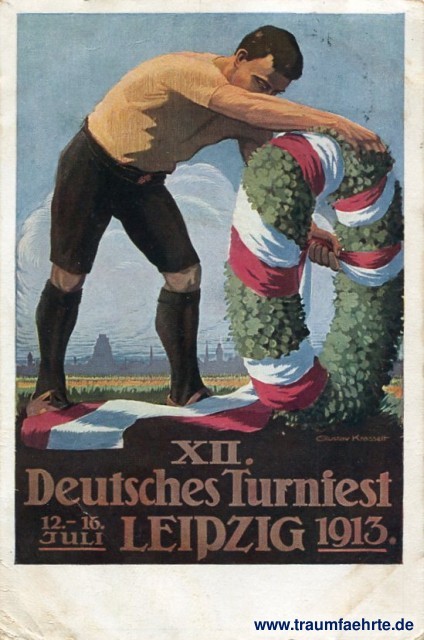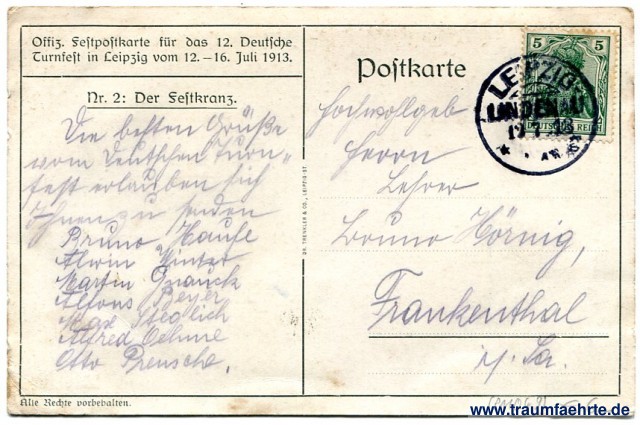– Details – Year: 1913 Postal state: postally used at begin of festival (12th July 1913) Inscription front: XII. Deutsches Turnfest, 12.-16. Juli, Leipzig 1913. Inscription back: Postkarte, Offiz. Festpostkarte für das 12. Deutsche Turnfest in Leipzig vom 12.-16. Juli 1913. Nr. 2: Der Festkranz. Alle Rechte vorbehalten. Dr. Trenkler & Co, Leipzig-St. Postmark(s): Leipzig-Lindenau, (...), 12 7 13 Please note: