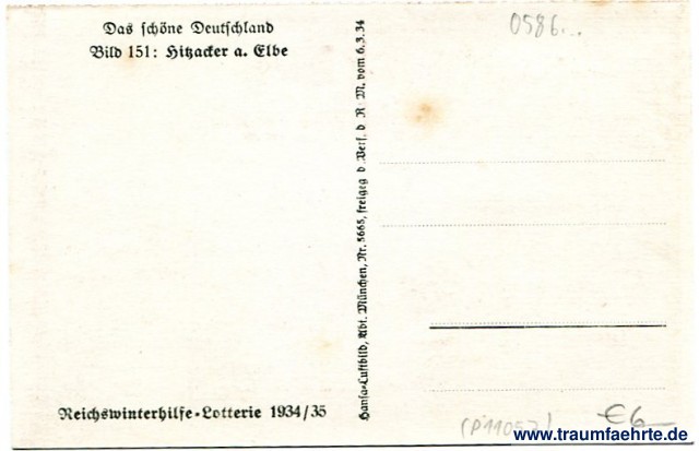 – Details – Jahr: 1934 Status: ungelaufen Beschriftung vorne: kein Text Beschriftung hinten: Das schöne Deutschland, Bild 151: Hitzacker a. Elbe, Reichswinterhilfe-Lotterie 1934/35, Hansa-Luftbild, Abt. München, Nr. 5665, freigeg d. Verf. D. R. M. vom 6.3.34 Stempel: keine Hinweis: