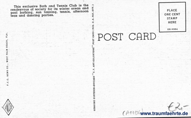 – Details – Year: 1940 Postal state: postally unused Inscription front: C26 – Exclusive Bath and Tennis Club, Palm Beach, Fla. Aero-Graphic Corp. Photo, Courtesy Eastern Air Lines Inscription back: Post Card, This exclusive Bath and Tennis Club is the rendezvous of society for ist winter ocean and pool bathingm sun tanning, tennis, afternoon teas and dancing parties. UNCO, F.E.C. News Co., West Palm Beach, Fla. Genuine Curteich-Chicago C.T. Art-Colortone Post Card (Reg. U.S. Pat. Off.) Place one cent stamp here, 0B-H984 Postmark(s): none Please note: