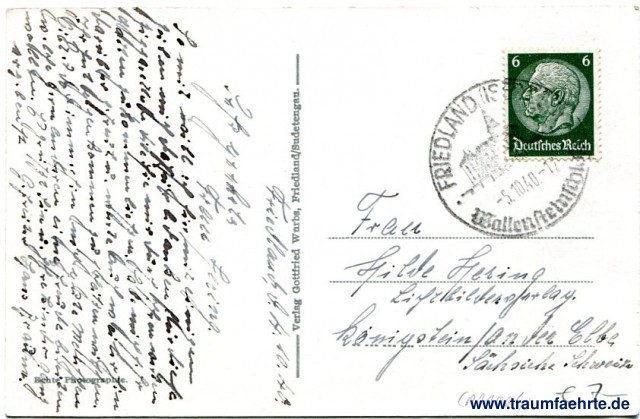 – Details – Year: ca. 1935 Postal state: postally used 1940 Inscription front: Friedland. Sudetengau. Inscription back: Verlag Gottfried Wurbs, Friedland/Sudetengau. Postmark(s): Friedland (Isergebirge), Wallensteinschloss, – 5.10.40.-12 Please note: