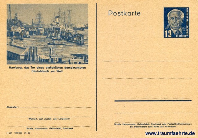 – Details – Jahr: ca. 1950 Status: ungelaufen Beschriftung vorne: Postkarte, Hamburg, das Tor eines einheitlichen demokratischen Deutschlands zur Welt, Absender: ... Wohnort, auch Zustell- oder Leitpostamt, ..., Straße, Hausnummer, Gebäudeteil, Stockwerk, ..., Straße, Hausnummer, Gebäudeteil, Stockwerk oder Postschließnummer ; bei Untermietern auch Name des Vermieters, M 301, 1000 000 IX. 50 Beschriftung hinten: kein Text Stempel: keine Hinweis: