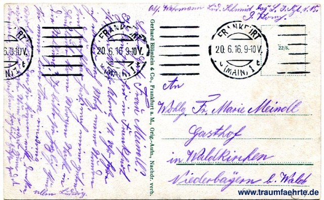 – Details – Jahr: ca. 1915 Status: gelaufen ohne Briefmarke (Feldpost), 1916 Beschriftung vorne: Frankfurt a. M , Kaffee Hauptwache mit Blick in die Zeil Beschriftung hinten: Gerhard Blümlein & Co., Frankfurt a. M., Orig.-Aufn., Nachdr. verb. 22/8. Stempel: 2½x Frankfurt (Main), (...), 1 t, 20.6.16. 9-10V.; --- Hinweis: