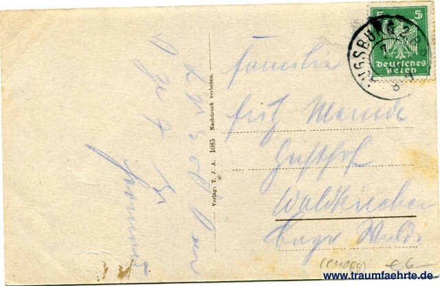 – Details – Jahr: ca. 1920 Status: gelaufen 1925 Beschriftung vorne: Augsburg. Waldrestauration u. Floßhafen an dem Hochablaß. Beschriftung hinten: Verlag: T. J. A. 1085. Nachdruck verboten. Stempel: Augsburg 2. (B...), 8, 7 (...) 25 Hinweis: