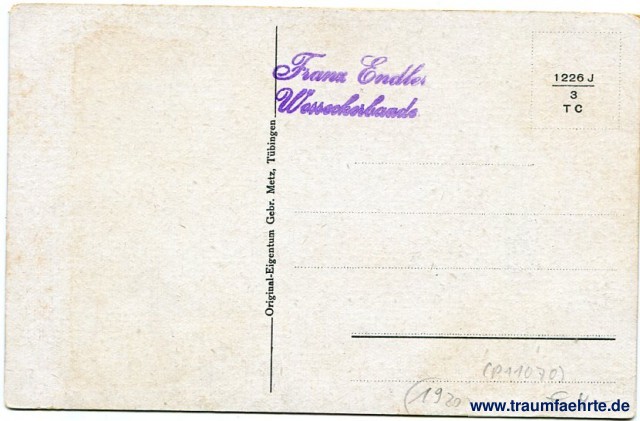 – Details – Jahr: ca. 1920 Status: ungelaufen Beschriftung vorne: Wosseckerbaude 1260 m ü. M. (Riesengebirge) Beschriftung hinten: Original-Eigentum Gebr. Metz, Tübingen, 1226 J 3 TC Stempel: Franz Endler, Wosseckerbaude Hinweis: