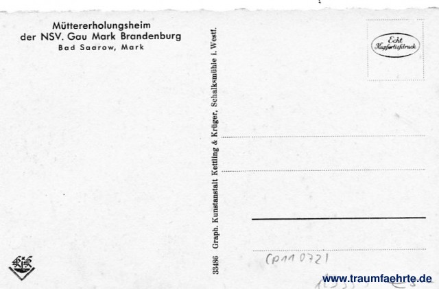 Beschriftung hinten: Müttererholungsheim der NSV. Gau Mark Brandenburg, Bad Saarow, Mark, 33486 Graph. Kunstanstalt Kettling & Krüger, Schalksmühle i. Westf. Echte Photographie, K K