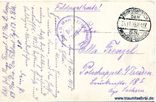 – Details – Jahr: ca. 1910 Status: gelaufen ohne Briefmarke (Feldpost), 1915 Beschriftung vorne: Meulebeke – Kasteel Bossuyt. 19514 – Photo Sacrez. Beschriftung hinten: kein Text Stempel: Feldpostexpedition der 53. Reserve-Division, 21.11.15.11-12V; Brief-Stempel 2. Batt. R(...) Regiments Nr. 53 Hinweis: