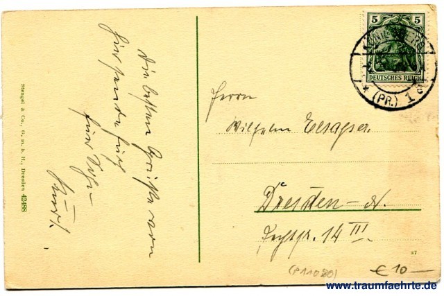 – Details – Year: ca. 1910 Postal state: postally used 1915 Inscription front: Königsberg i. Pr. – Schlossteich Inscription back: Stengel & Co., G. m. b. H., Dresden 42488, z7 Postmark(s): Königsberg (Pr.) 1 (e), -6. 2.15.8-9 Please note: