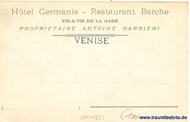 – Details – Jahr: ca. 1900 Status: ungelaufen Beschriftung vorne: Restaurant Barche Beschriftung hinten: Hôtel Germania – Restaurant Barche, Vis-a-vis de la gare, Proprietaire Antoine Barbieri, Venise, (...) Stempel: keine Hinweis: