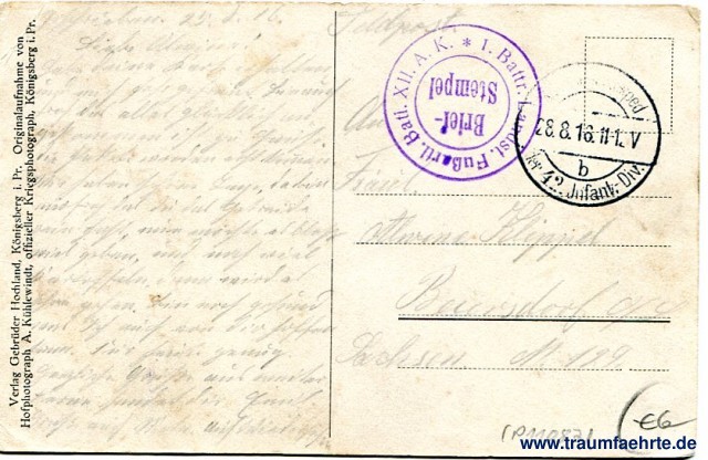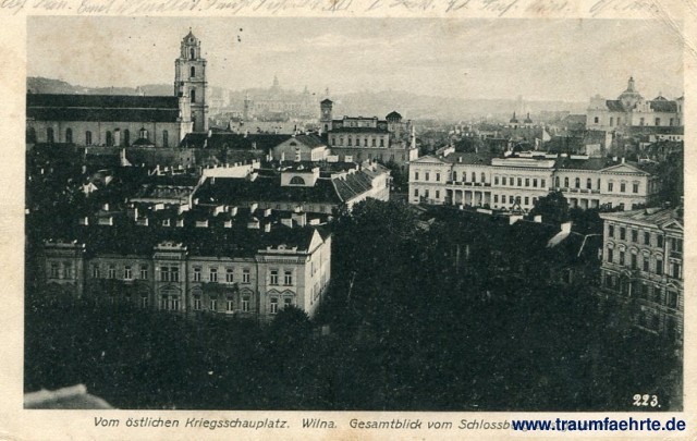 – Details – Jahr: ca. 1915 Status: gelaufen ohne Briefmarke (Feldpost), 1916 Beschriftung vorne: Vom östlichen Kriegsschauplatz. Wilna. Gesamtblick vom Schlossberg aus gesehen, 223. Beschriftung hinten: Verlag Gebrüder Hochland, Königsberg i. Pr. Originalaufnahme von Hofphotograph A. Kühlewindt, offizieller Kriegsphotograph, Königsberg i. Pr. Stempel: (...exped) der 42. Infant.-Div. 28.8.16.11-12V; Brief-Stempel, 1. Battr.Landst. Fußartl. Batl. XII. A.K. * Hinweis: