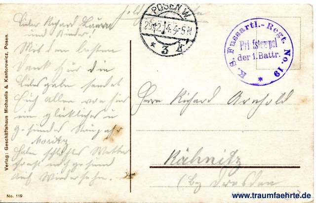 – Details – Jahr: ca. 1910 Status: gelaufen ohne Briefmarke (Feldpost), 1914 Beschriftung vorne: Posen. Alter Markt mit Rathaus. Beschriftung hinten: Verlag: Geschäftshaus Michaelis & Kantorowicz, Posen. No. 119 Stempel: Posen W, * 3 k, 29.12.14.4-5N; Briefstempel der 1. Battr, K. S. Fussartl.-Regt. No. 19 * Hinweis: