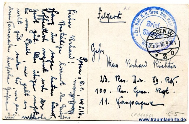 – Details – Year: ca. 1915 Postal state: postally used without stamp (military mail), 1916 Inscription front: Posen, Kgl. Residenzschloß Inscription back: Tx 214. Postmark(s): Posen W, * 3 o, 25.5.16.9-10V; Brief-Stempel, * Ers. Batl. K. S. Gren. Res. Regt. Nr. 100 * Werk Komp. Please note: