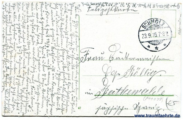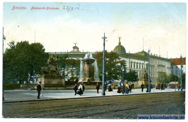 – Details – Jahr: ca. 1915 Status: gelaufen ohne Briefmarke (Feldpost), 1916 Beschriftung vorne: Breslau. Bismarck-Brunnen. Beschriftung hinten: 47 Stempel: Schmolz, * * *, 23.9.16 7-8V. Hinweis: