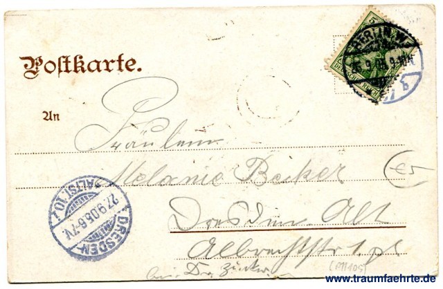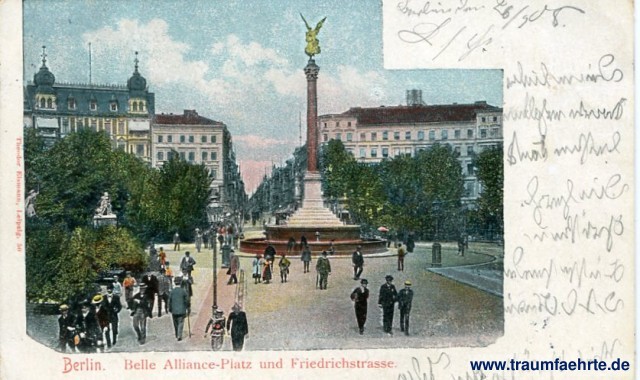 – Details – Jahr: ca. 1900 Status: gelaufen 1905 Beschriftung vorne: Berlin. Belle Alliance-Platz und Friedrichstrasse. Theodor Eismann, Leipzig. 50 Beschriftung hinten: Postkarte. An ... Stempel: Berlin W, * (...) b, 26.9.05 9-10N; Dresden-Altst. 10, i, 27.9.05.6-7V. Hinweis: