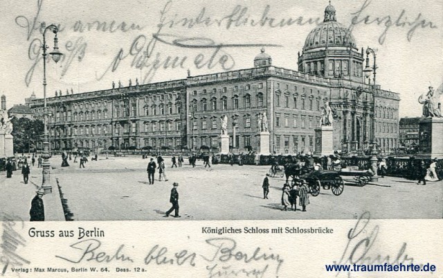 – Details – Year: ca. 1905 Postal state: postally used 1907 Inscription front: Gruss aus Berlin, Königliches Schloss mit Schlossbrücke, Verlag: Max Marcus, Berlin W. 64. Dess. 12a. Inscription back: Postkarte Postmark(s): Berlin N.W., * 40 a, 26.3.07.11-12N.; Pl(...), ***, 27.3.07.2-3N Please note: