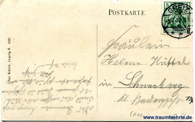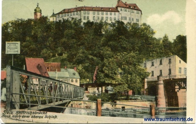 – Details – Jahr: ca. 1905 Status: gelaufen 1907 Beschriftung vorne: Greiz Heinrichsbrücke, Blick nach den oberen Schloss Beschriftung hinten: Postkarte, Max Scholz, Leipzig-R. 6287 Stempel: Greiz, * * g, -8.7.07. 12-11(...) Hinweis: