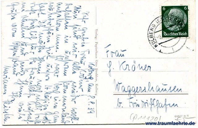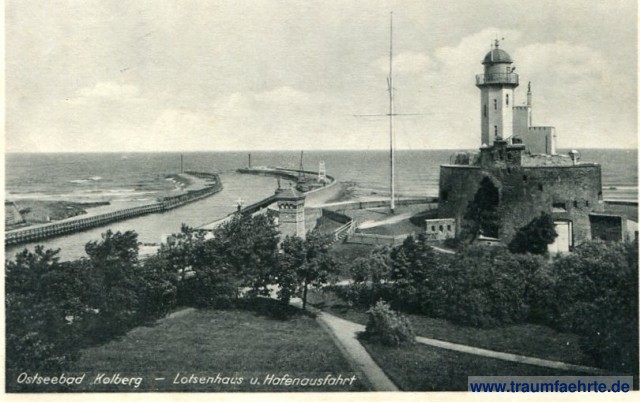 – Details – Jahr: ca. 1935 Status: gelaufen 1939 Beschriftung vorne: Ostseebad Kolberg – Lotsenhaus u. Hafenausfahrt Beschriftung hinten: Verlag: Papierhaus Otto Strehlow, Kolberg, 64827 m H Stempel: Kolberg (Ostseebad), l, -8.8.39-22 Hinweis: