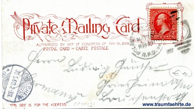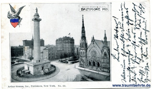 – Details – Jahr: ca. 1900 Status: gelaufen 1902 Beschriftung vorne: Mount Vermon Place, Baltimore MD. Arthur Strauss, Inc., Publishers, New York. No. 151. Beschriftung hinten: Private Mailing Card, Authorized by Act of Congress of May 19th 1898. Postal Card – Carte Postale, This side is for address. Stempel: Rolandpark (...), May 20, 11 30 p,. R.P.O.; 1902; Griesheim (Main), 30.5.02.2-3N. Hinweis: