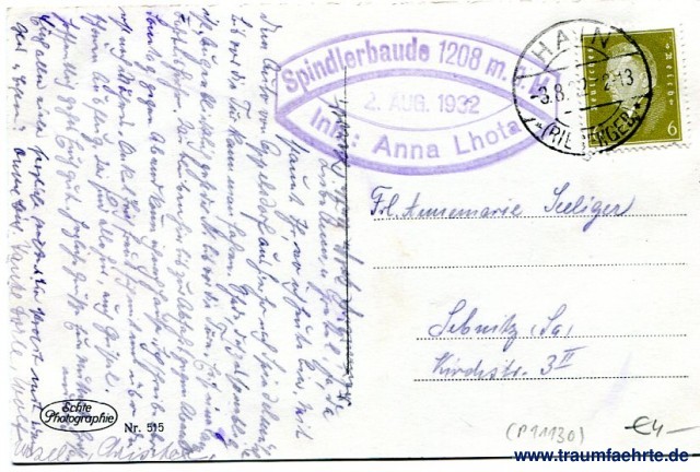 – Details – Jahr: ca. 1930 Status: gelaufen 1932 Beschriftung vorne: Jugendkammhaus Rübezahl, Riesengebirge. Spindlerbaude Beschriftung hinten: Echte Photographie, Nr. 515 Stempel: Spindlerbaude 1208 m. ü. M. Inh: Anna Lhota, 2. Aug 1932; Hayn (Riesengeb.), -3.8.32 12-13 Hinweis: