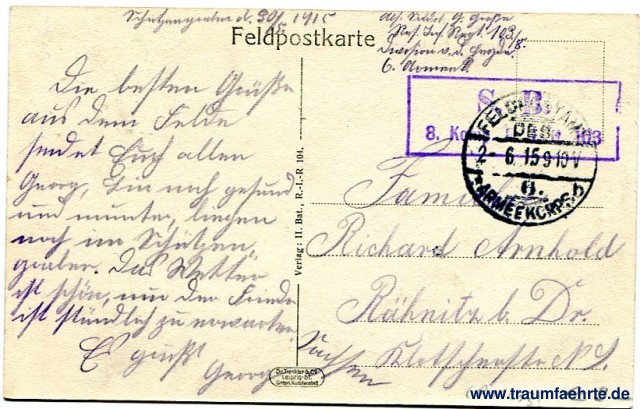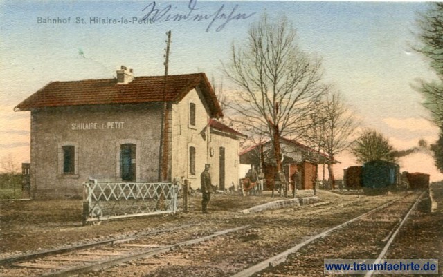 – Details – Jahr: ca. 1910 Status: gelaufen ohne Briefmarke (Feldpost), 1915 Beschriftung vorne: Bahnhof St. Hilaire-le-Petit Beschriftung hinten: Feldpostkarte, Verlag: II. Bat., R.-I.-R. 104. Dr. Trenkler & Co, Leipzig-St. Graph. Kunstanstalt Stempel: S. B. 8. Komp. (...) 103; Feldpostamt 6. Armeekorps, b, 2- 6.15 9-10V Hinweis: