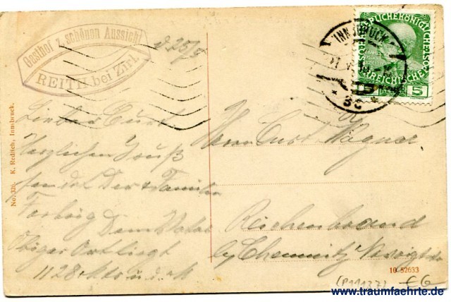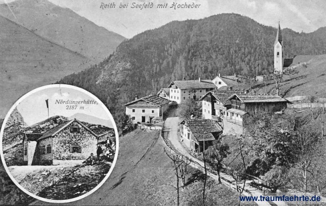 – Details – Year: ca. 1905 Postal state: postally used 1910 Inscription front: Reith bei Seefeld mit Hocheder, Nördlingerhütte 2187 m Inscription back: No. 326. K. Redlich, Innsbruck. 10 52633 Postmark(s): Innsbruck, 3(...), 27 V 10 – 16 Please note: