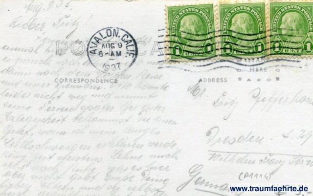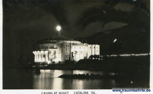 – Details – Jahr: ca. 1935 Status: gelaufen 1937 Beschriftung vorne: Casino at night, Catalina Isl. (C) Beschriftung hinten: Post Card, Correspondence, Address, (...) stamp here Stempel: Avalon, Calif. Aug 9, 8 – am, 1937; ~~~ Hinweis: