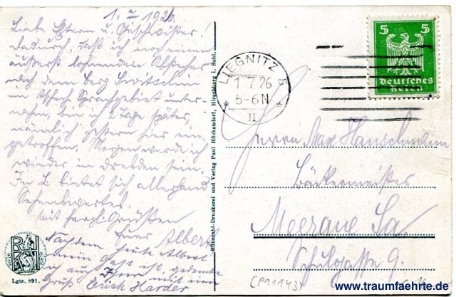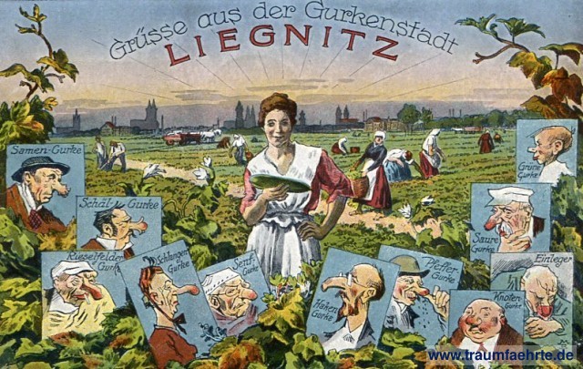 – Details – Jahr: ca. 1925 Status: gelaufen 1926 Beschriftung vorne: Grüsse aus der Gurkenstadt Liegnitz, Samen-Gurke, Schäl-Gurke, Rieselfelder Gurke, Schlangen-Gurke, Senf-Gurke, Haken-Gurke, Pfeffer-Gurke, Knoten-Gurke, Einleger, Saure Gurke, Grüne Gurke, M B Beschriftung hinten: RKH Schutzmarke, Lgtz. 891. Rübezahl-Druckerei und Verlag Paul Höckendorf, Hirschberg i. Schl. Stempel: Liegnitz, * II *, 1 7 26, 5-6N; --- Hinweis: