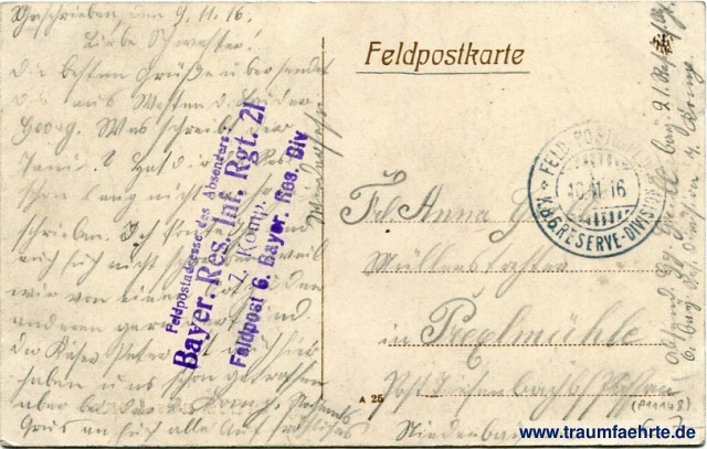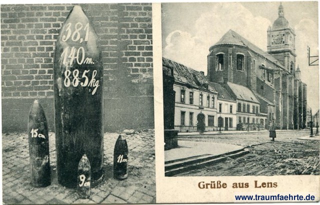 – Details – Jahr: ca. 1915 Status: gelaufen ohne Briefmarke (Feldpost), 1916 Beschriftung vorne: Grüße aus Lens, 38,1, 140 m. 885 kg, 15 cm, 9 cm, 11 cm Beschriftung hinten: Feldpostkarte, (...), A 25 Stempel: Feld-Postexped. K.B.6. Reserve-Divisiom, 10.11.16; Feldpostadresse des Absenders : Bayer. Res. Inf. Rgt. 21, 7. Komp. Feldpost 6. Bayer. Res. Div. Hinweis: