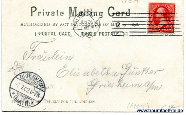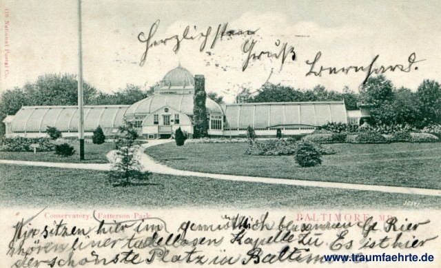 – Details – Jahr: ca. 1900 Status: gelaufen 1902 Beschriftung vorne: Baltimore, MS. Conservatory, Patterson Park, 110 National Postcard Co. 3G571 Beschriftung hinten: Private Mailing Card, Authorized by act of Congress of May 19 1898. (Postal card – Carte postale), This side is exclusivelyfor the address, Stempel: Baltimore, MD., Jun 26, 11 30pm, 1902; ---; Griesheim (Main), -7.7.02. 6-7N. Hinweis: