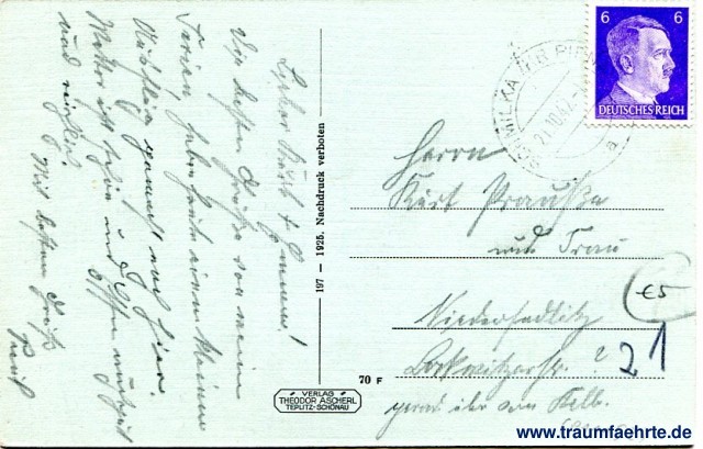 – Details – Year: 1925 Postal state: postally used 1942 Inscription front: Tetschen a. d. E. mit Obergrund Inscription back: Verlag Theodor Ascherl, Teplitz-Schönau, 197 – 1925. Nachdruck verboten. 70 F Postmark(s): Schmilka Kr. Pirna, a, 21.10.42.-1(...) Please note: